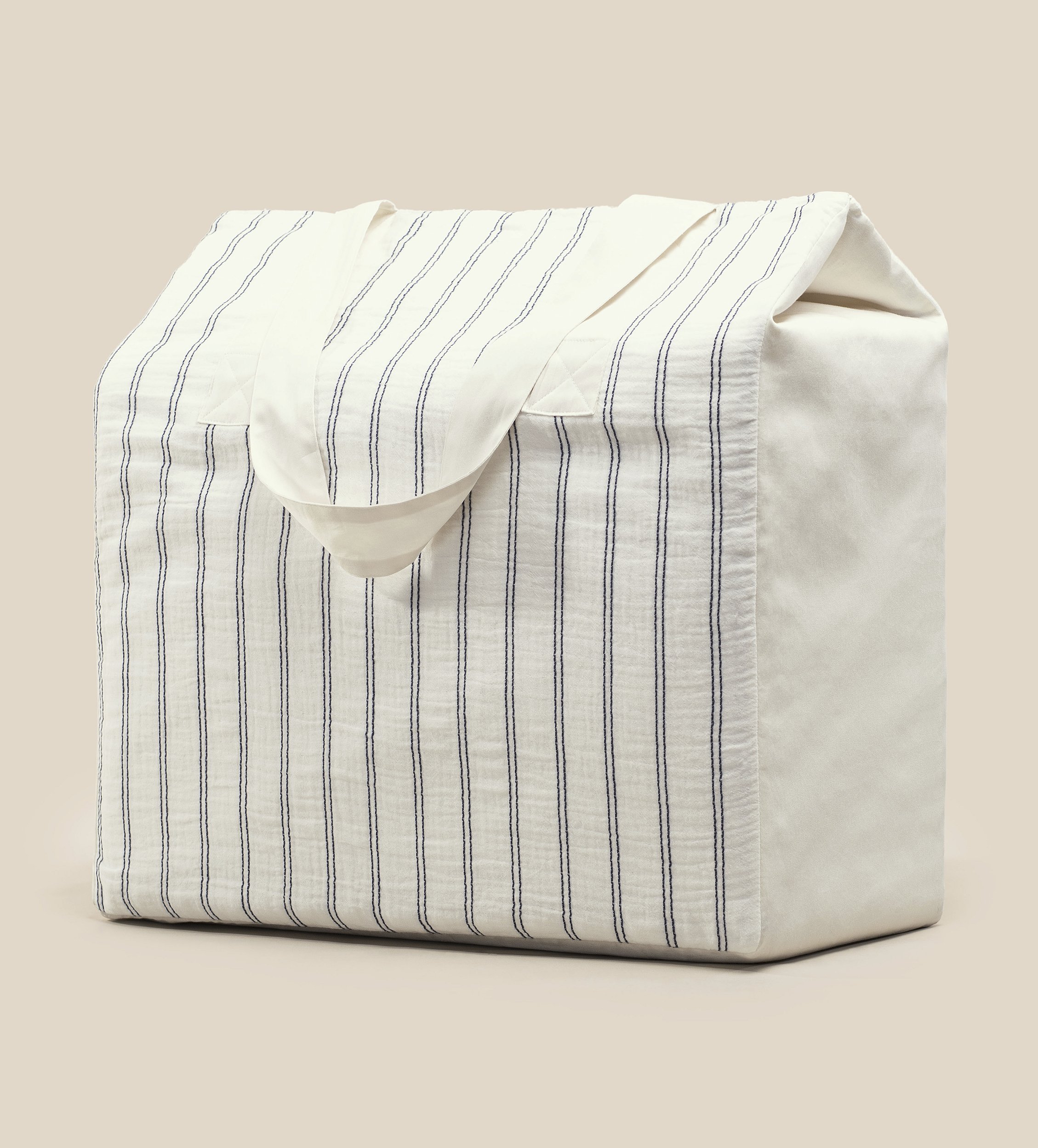 A embalagem do Jogo de Colcha Marine Algodão Delicado tem as mesmas características do produto e pode ser utilizada como bolsa.